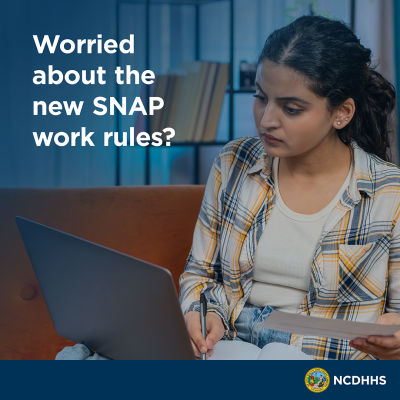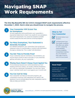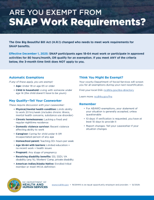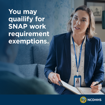 | Caption: Are you worried about new SNAP work requirements? Many people qualify for exemptions. If you are pregnant, have a disability, live with a child under 14, or have health conditions that limit your ability to work, you may be exempt. Your county DSS will screen you for all exemptions. Learn more: ncdhhs.gov/fns. |