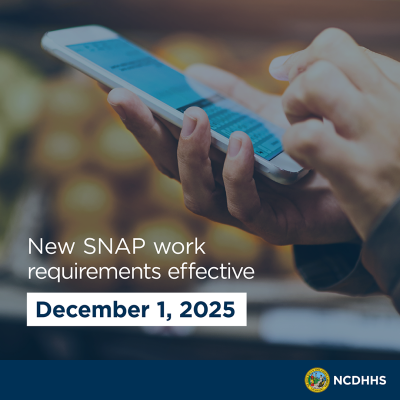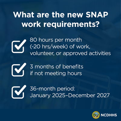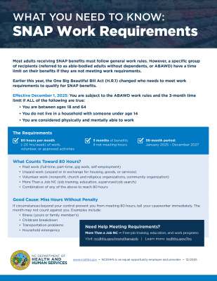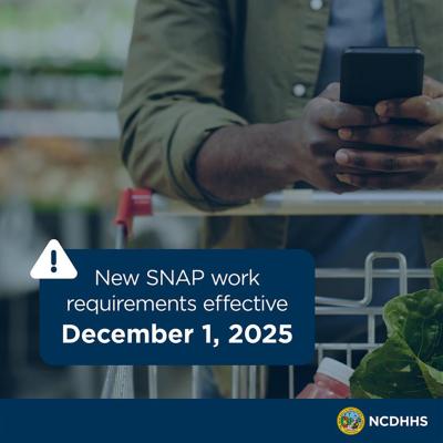 | Caption: New changes to SNAP work rules went into effect on Dec. 1. Some people ages 18-64 who were previously exempt, such as veterans, may now be subject to work requirements. To learn more about the new rules, visit ncdhhs.gov/fns. |