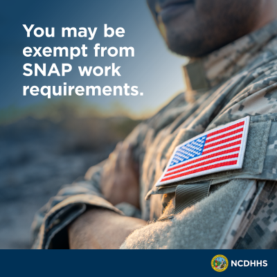 | Veterans Caption: Veterans: If you receive VA disability compensation at ANY percentage you may be exempt from SNAP work requirements. Make sure your caseworker knows about your VA benefits. Learn more at: ncdhhs.gov/fns. |